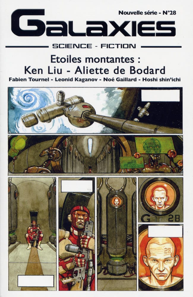 Nouveauté de ce numéro 28, une bande dessinée : le Trou ! Le scénario et les dessins sont de Barpov. Il a d’ailleurs assuré la couverture de ce Galaxies. Cette histoire courte pourrait avoir un cousinage avec le thème de la nouvelle Japonaise. Les noirs, blancs et gris y sont maîtrisés, et Barpov sait conduire un récit. Seul petit bémol, son lettrage ne ressort pas toujours très clairement sur le format réduit de la revue. Cependant, le test prouve, comme l’a déjà fait AOC, que la BD a sa place dans les colonnes d’une revue.