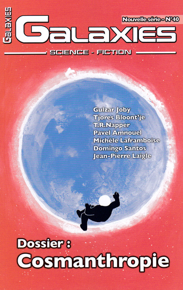 Le Guide ultime pour une Stratégie gagnante de Formation des Prix sur le Marché des Paris extraterrestres de T.R. Napper est finalement plus sage que son titre pourrait le laisser supposer. Si tant est que la vie d’un parieur puisse être sage ! L’Article 3,14 de T’jores Bloontje pourrait tourner en rond sur le sujet des arcanes administratifs de la législature. Eh bien, pas du tout ! Non sans humour noir, bien sûr. Douze milliards d’artistes permet de retrouver Gulzar Joby et sa plume si particulière. Ici, il nous concocte un univers futuriste où la redécouverte de la lecture n’est pas sans risque pour celui qui s’y adonne. Le dossier consacré à la Cosmanthropie s’ouvre sur un panorama de lecture par le porteur du projet : Jean-Pierre Laigle. Avec le sous-titre un aspect du transformisme cosmique chez l’homme dans la science-fiction, il laisse déjà présager de l’usage final généralement prosaïque de cette adaptation. De fait, dans l’histoire moderne de la SF, ce thème, voire sous-genre, n’a guère été abordé que par une poignée d’auteurs et, très souvent, dans un but pragmatique, dans le sens de l’économie libérale : celle d’avoir des ouvriers aptes à bosser dans n’importe quel environnement ! Une petite bibliographie complète cette approche pertinente. Les témoignages de Jorge Luis Calife (Brésil), Laurent Genefort (France) et Linda Nagata (États-Unis), trois écrivains ayant profité de ce sujet, apportent un éclairage plus sensible.