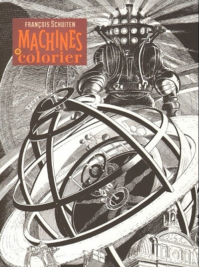 D’une trentaine de pages et au format 32×24 cm, le livre reprend plus de trente dessins de François Schuiten imprimés en noir & blanc sur du très beau papier propice au coloriage. Ces illustrations ont pour thème commun les machines, très présentes dans le monde de l’auteur. Bien que certains croquis aient été choisis dans un souci de simplicité de coloriage, la majorité des reproductions font réaliser toute la complexité de ses travaux, et son univers entre réalisme et onirisme, qui n’est pas sans me rappeler celui du Château des Étoiles d’Alex Alice.