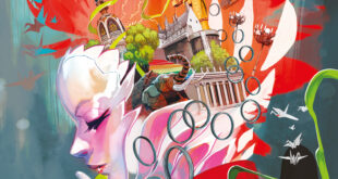Une falaise balayée par les vagues, une explosion de couleurs dans le ciel : rouge, vert, violet, rose – et des étoiles qui scintillent. Un garçon et une fille s’envolent en se tenant par la main.