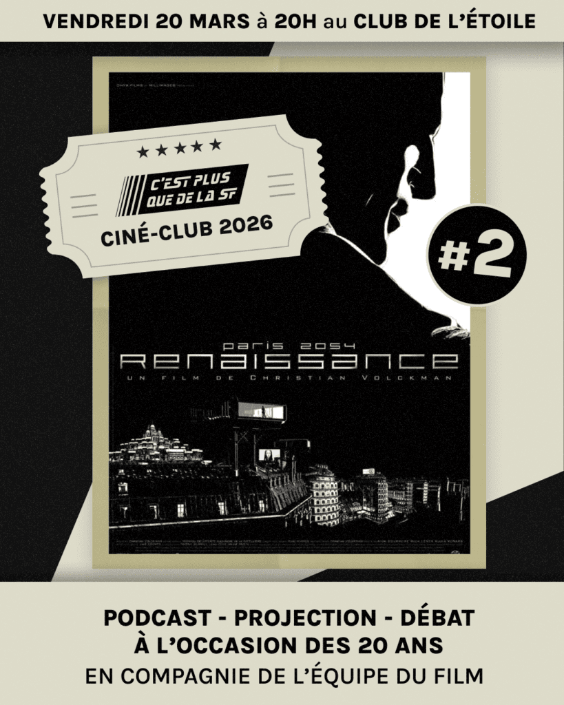 Le label « C’est plus que de la SF » organise un débat avec enregistrement du Podcast en direct, en présence du réalisateur Christian Volckmann, autour de son film d’animation « Renaissance » (2006), au Ciné-club « Le club de l’étoile ». Le débat sera suivi de la projection du film à 21h00.