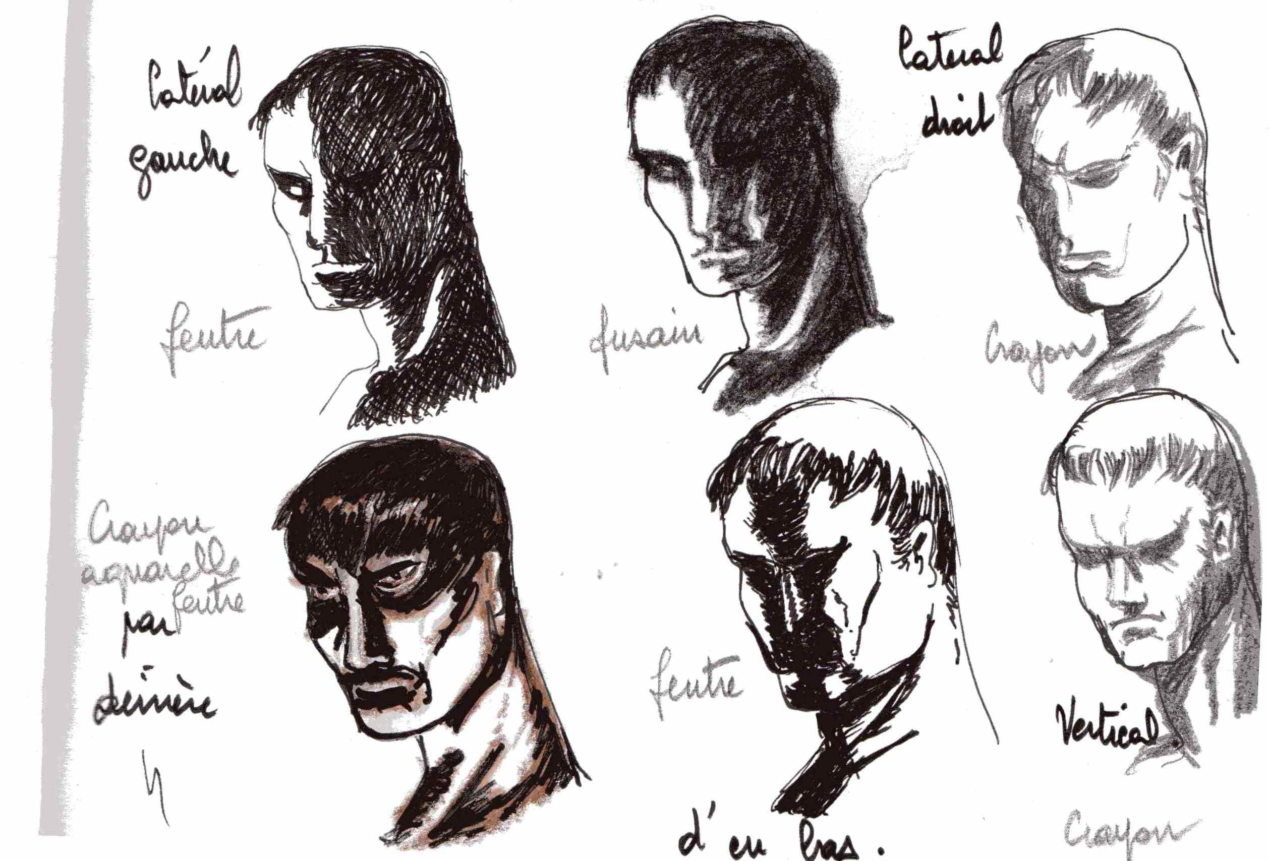 Voici les premiers jets d’Olivier (ombrages et feutre noir sur de l’aquarelle) :